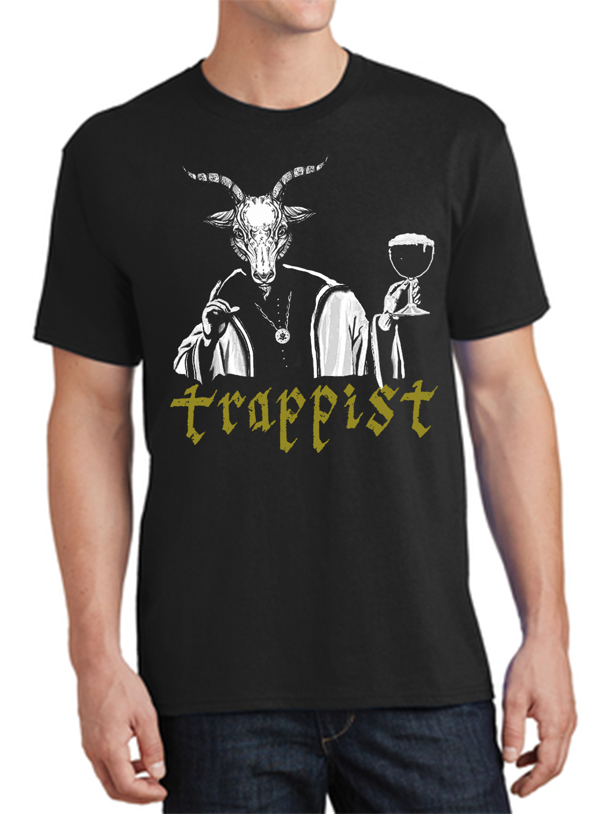 Our goat mascot (for now) holding a chalice of Trappist ale and about to say something profound on a shirt with Gold logo lettering.